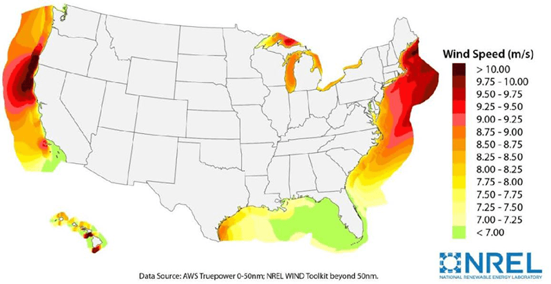 U.S. offshore wind resource data (100 m). Image from the National Renewable Energy Laboratory