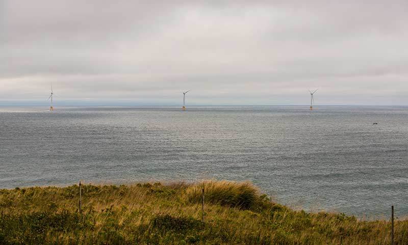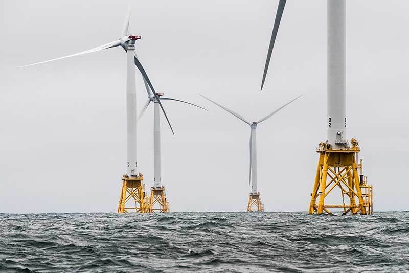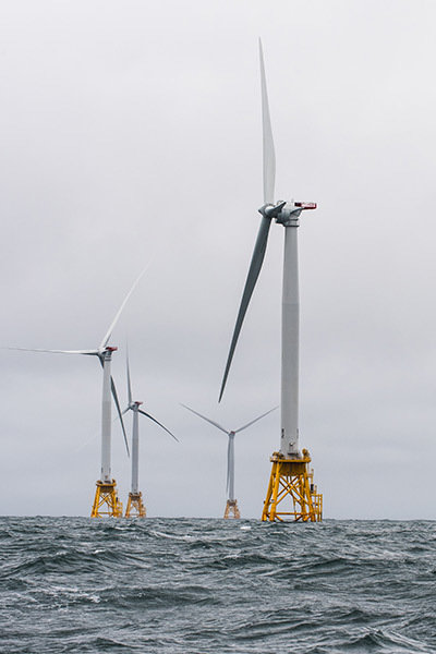 Four of the five GE Haliade 6-megawatt turbines that make up the Block Island Wind Farm. Photo by Dennis Schroeder, NREL 40447