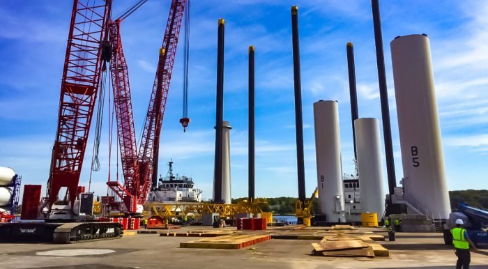 Components for the Block Island Wind Farm being unloaded. Photo from Deepwater Wind