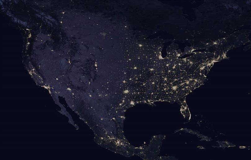 Composite image of continental United States at night in 2016. Image from Joshua Stevens using data from Miguel Román, NASA's Goddard Space Flight Center