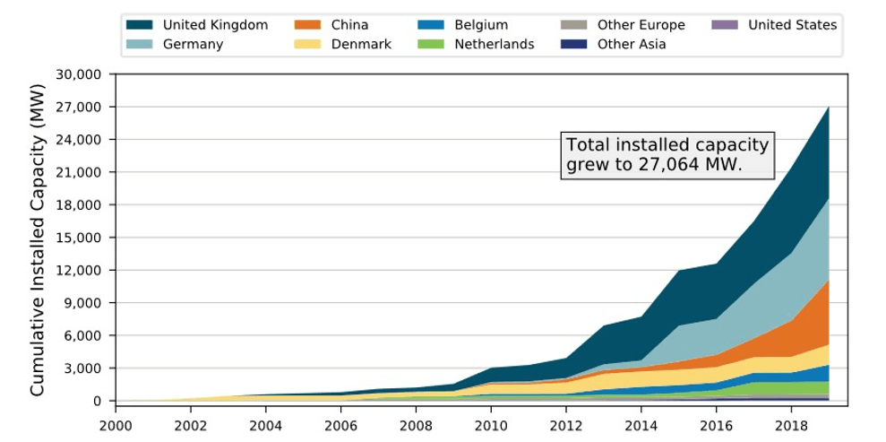 Global cumulative installed offshore wind capacity grew to 27,064 megawatts (MW) in 2019. The United Kingdom is still the largest offshore wind market with 8,478 MW installed, followed by Germany with 7,441 MW at the end of 2019.